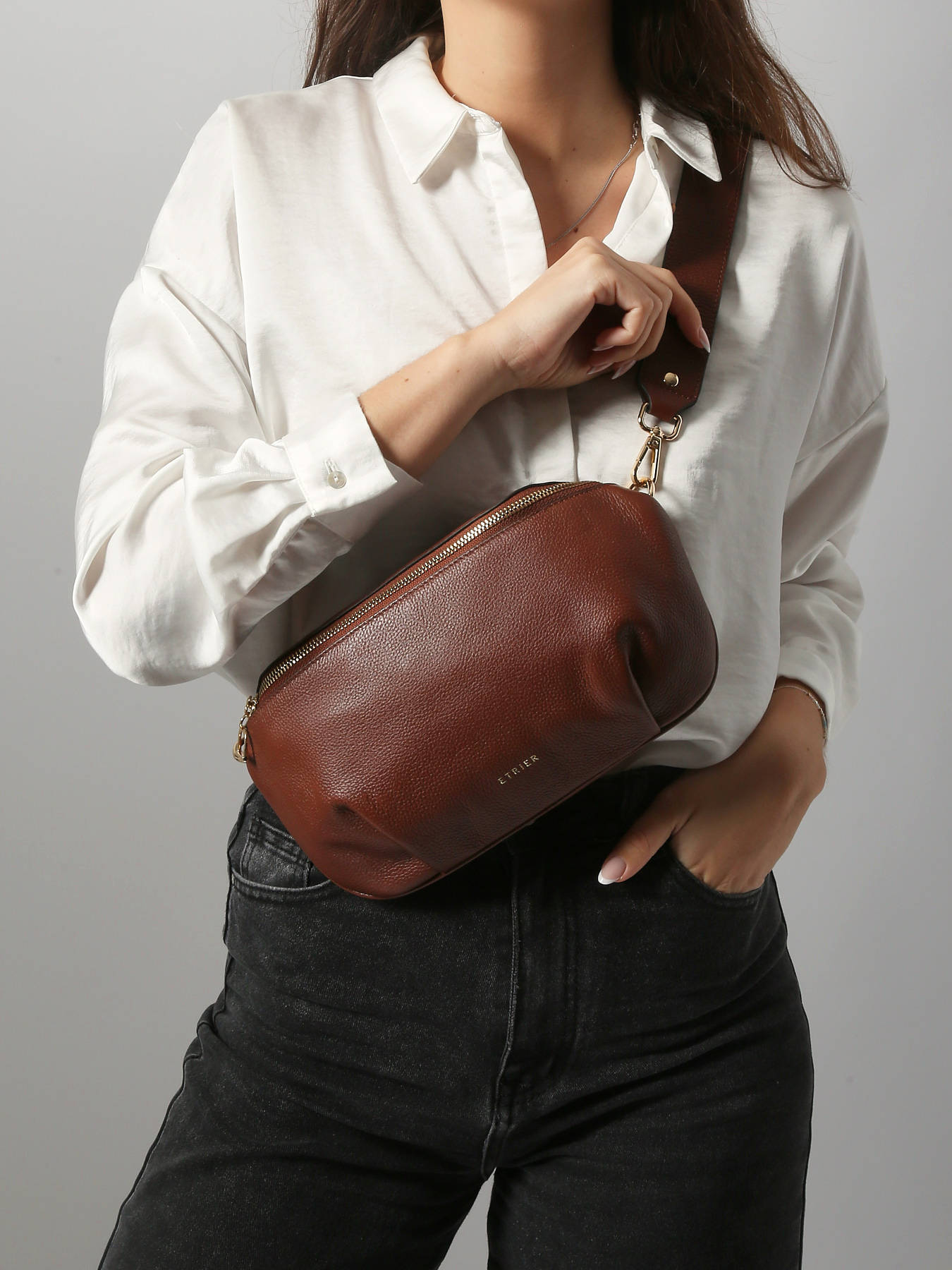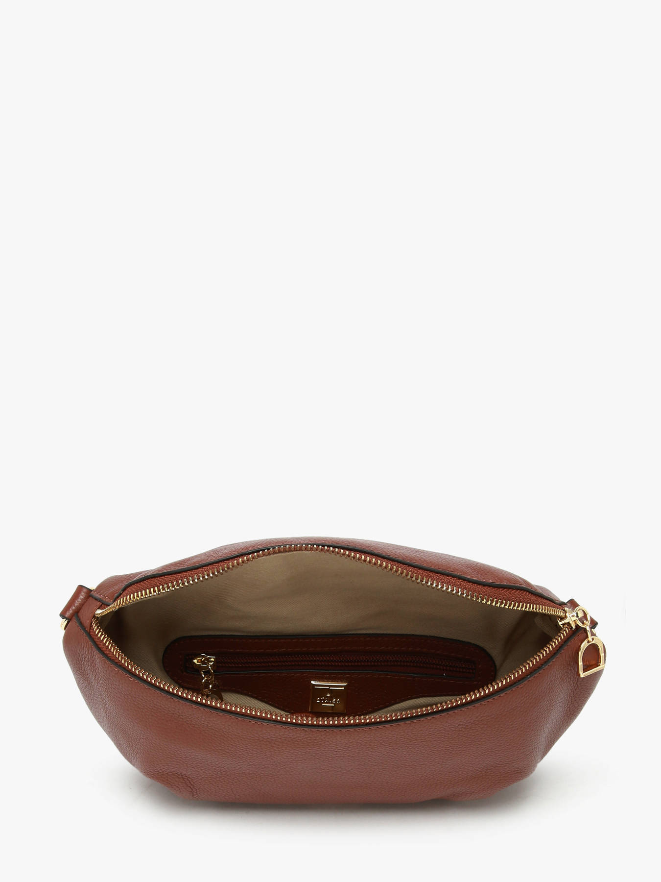 The maxi ETRIER belt bag from the TRADITION line is adorned with gold metal accessories and is available this season in trendy pastel colors. Made of cowhide leather, it features a back pocket and closes with a zipper. The wide removable and adjustable leather shoulder strap allows for wearing it crossbody. The spacious interior includes a compartment with a zip pocket and two patch pockets for optimal organization.